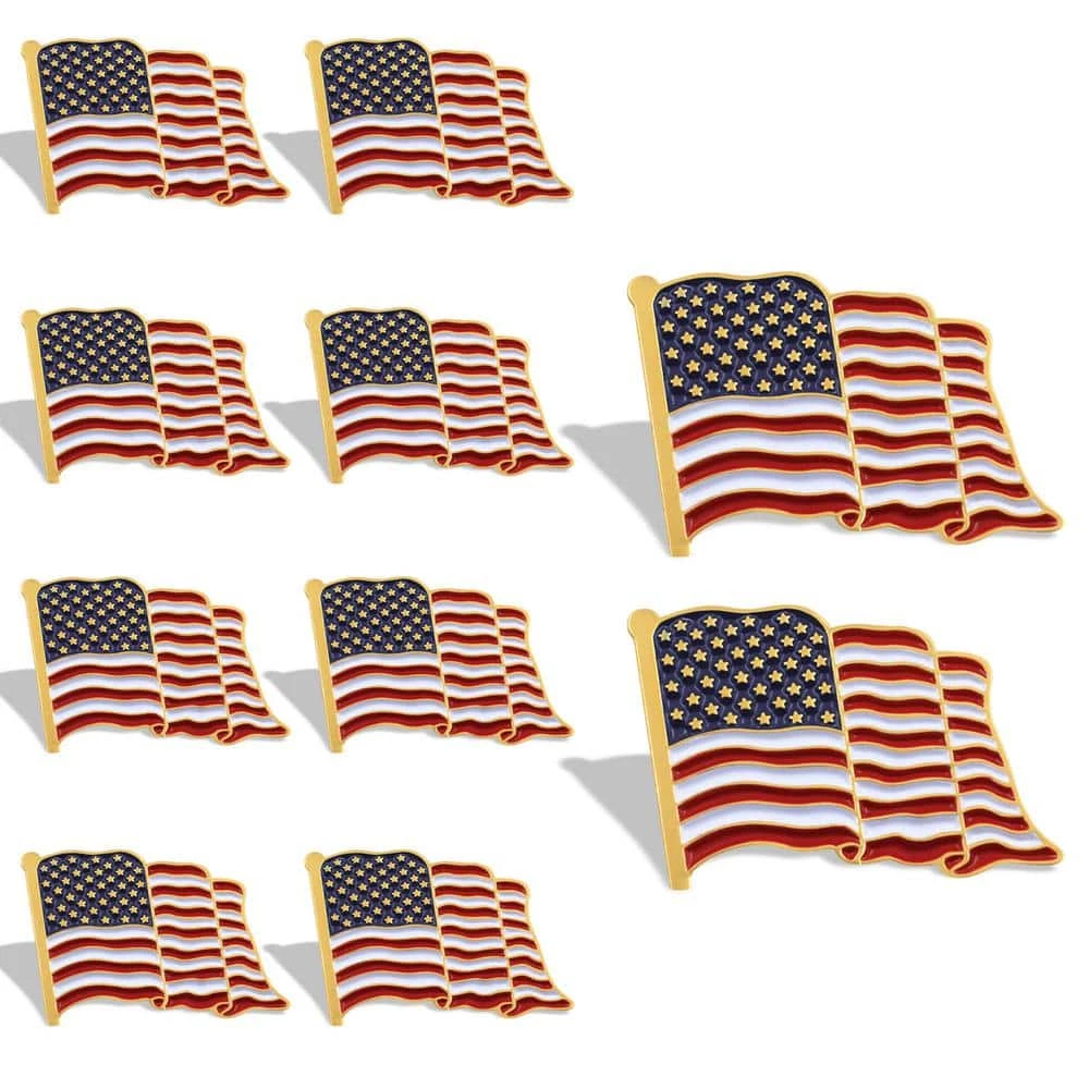 - SPECIFICATION – The USA flag lapel pin is about 1″ x 0.8″ x 0.08″. Each package contains 10 American flag pin.