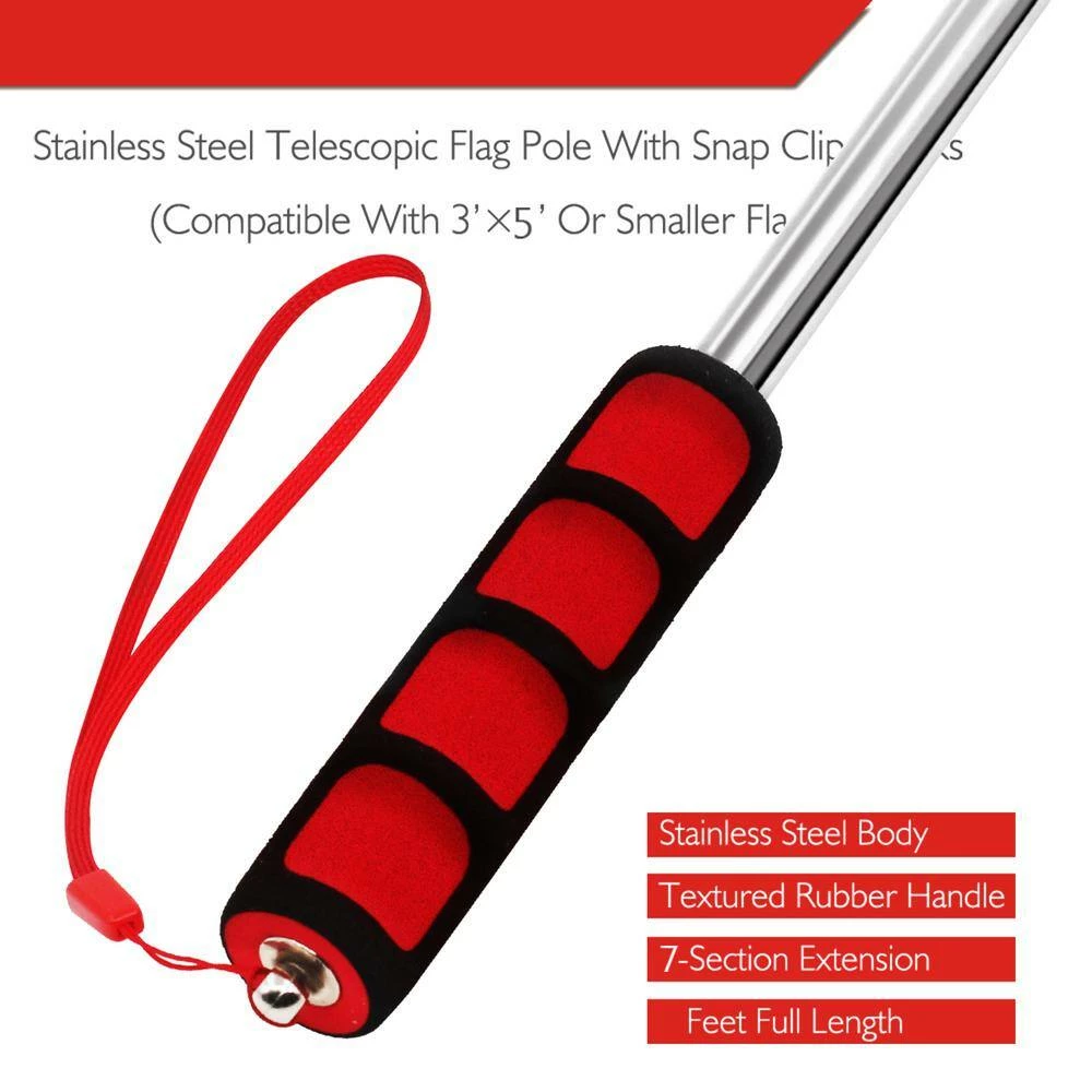 Lightweight – Our handheld flagpole is lightweight and retractable, making it easy to handle, store and carry. Perfect for long-term stationary use or for displaying your flag proudly on-the-go or at the beach. Durable – Unlike other flagpoles, the Telescopic Handheld Flagpole is made with a durable stainless-steel body and is crafted with precision mechanics to ensure long-term quality without the risk of degradation. All-inclusive – Unlike other sellers, there’s no need to buy zip ties because we include specialized clips manufactured specially for your new flagpole. Anti-Slip – Each Telescopic Handheld Flagpole is equipped with an textured rubber grip making it easy and comfortable to handle when wet or dry.