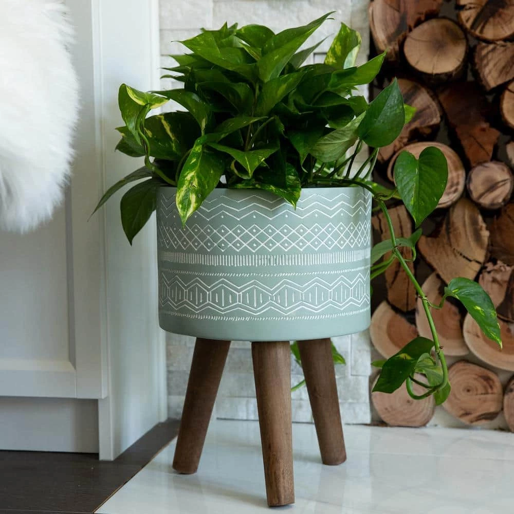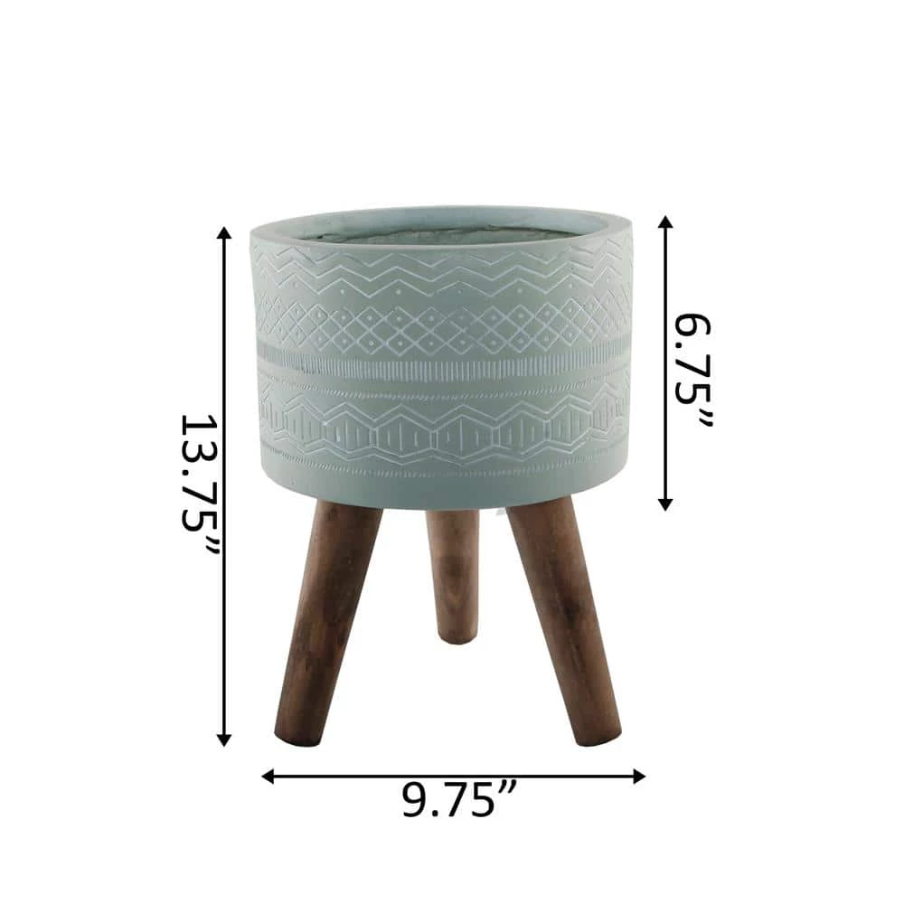 Decorate your space with our Tribal Fiberglass Planter with legs. Made of superior fiberglass material, which is stronger and lighter than cement, this planter will not disappoint. Hand-crafted by Artisans, our fiberglass planter with legs will help upgrade your plant game in style. Made of fiberglass with a tribal pattern and painted light gray and white, this planter will add a bit of chic nature to your living space. Buy a few at a time, so you can start your own little Garden indoors. (Hand-crafted by Artisans, Material: Fiberglass, Wood. Size: 9.75 in. x 9.75 in. x 6.75 in., Inter: 8.5 in. x 8.5 in. x 6 in. Capacity: 952.39. Color: gray, white). No drainage hole.