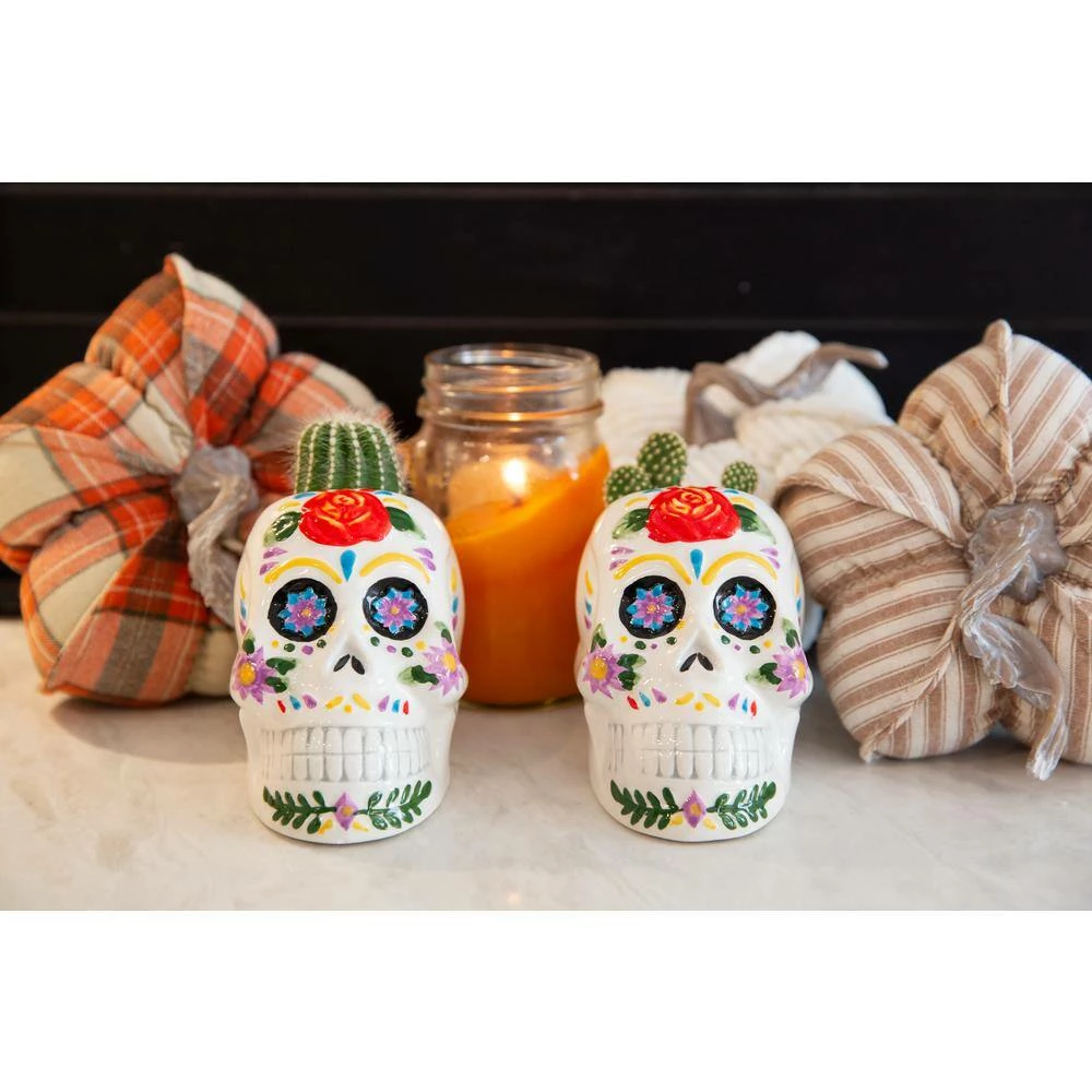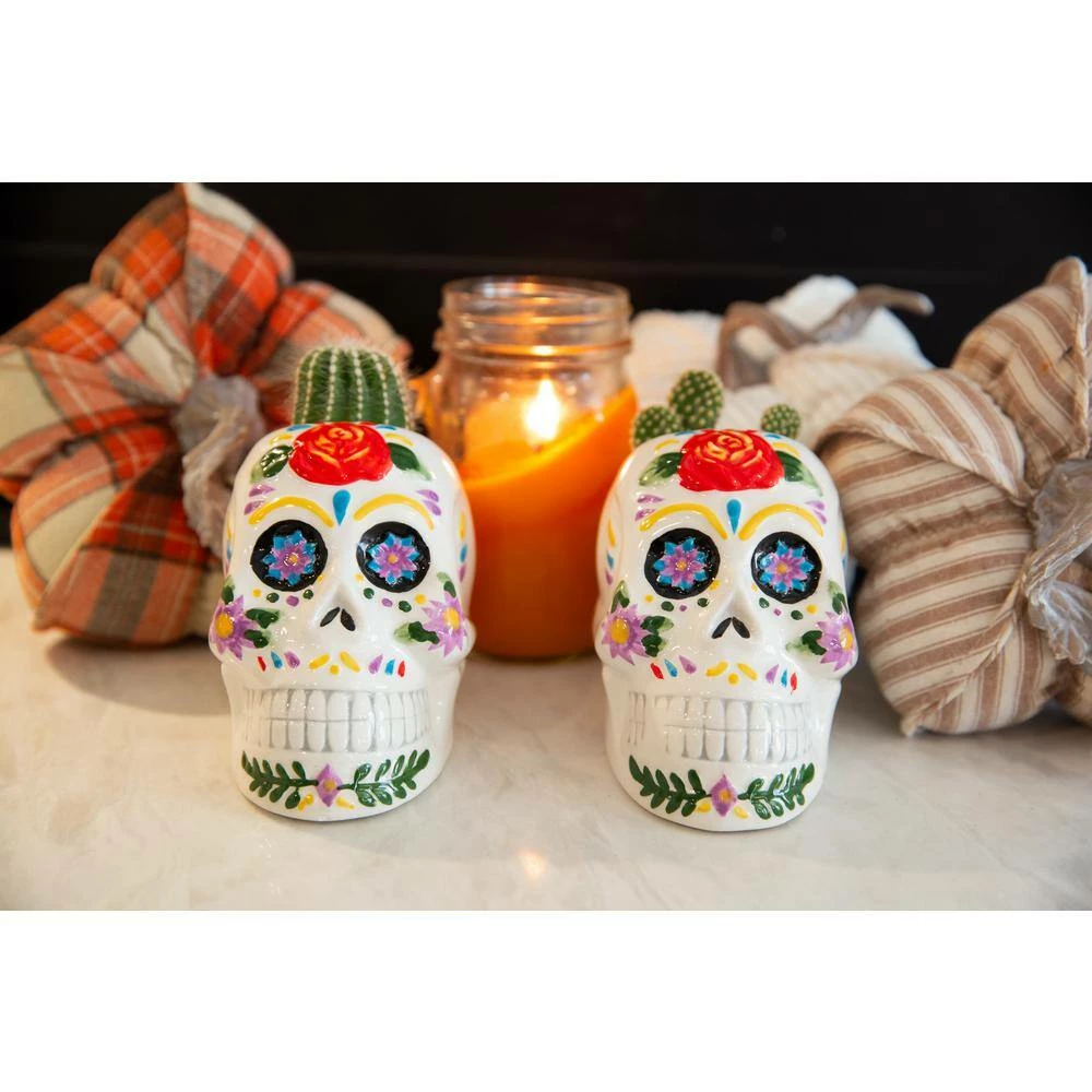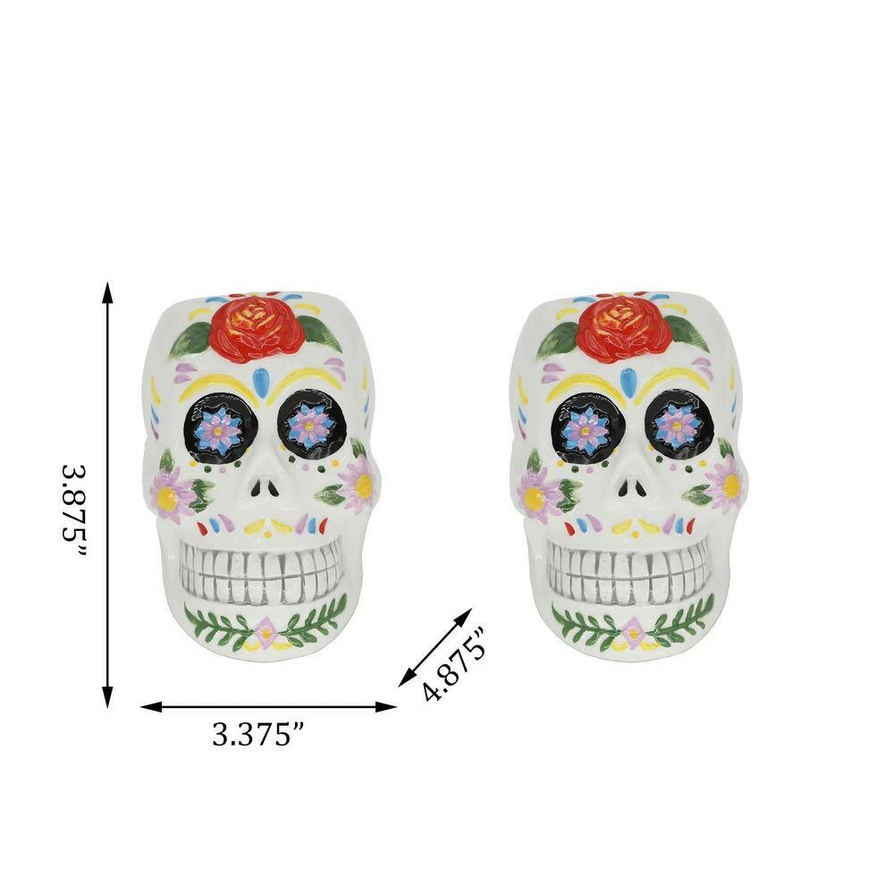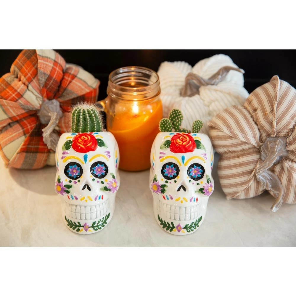 4 in. DOD colorful Skull Planter, Set of 2 Lovely Decor indoor planters. Measurement(inch): 4.875 in. x 3.375 in. x 3.875 in. Intersize(inch): 3.875 in. x 2.5 in. x 3.5 in. Capacity(oz.): 51.3 oz. Material: Ceramic. Color: White. No drainage hole, for Indoor use only.