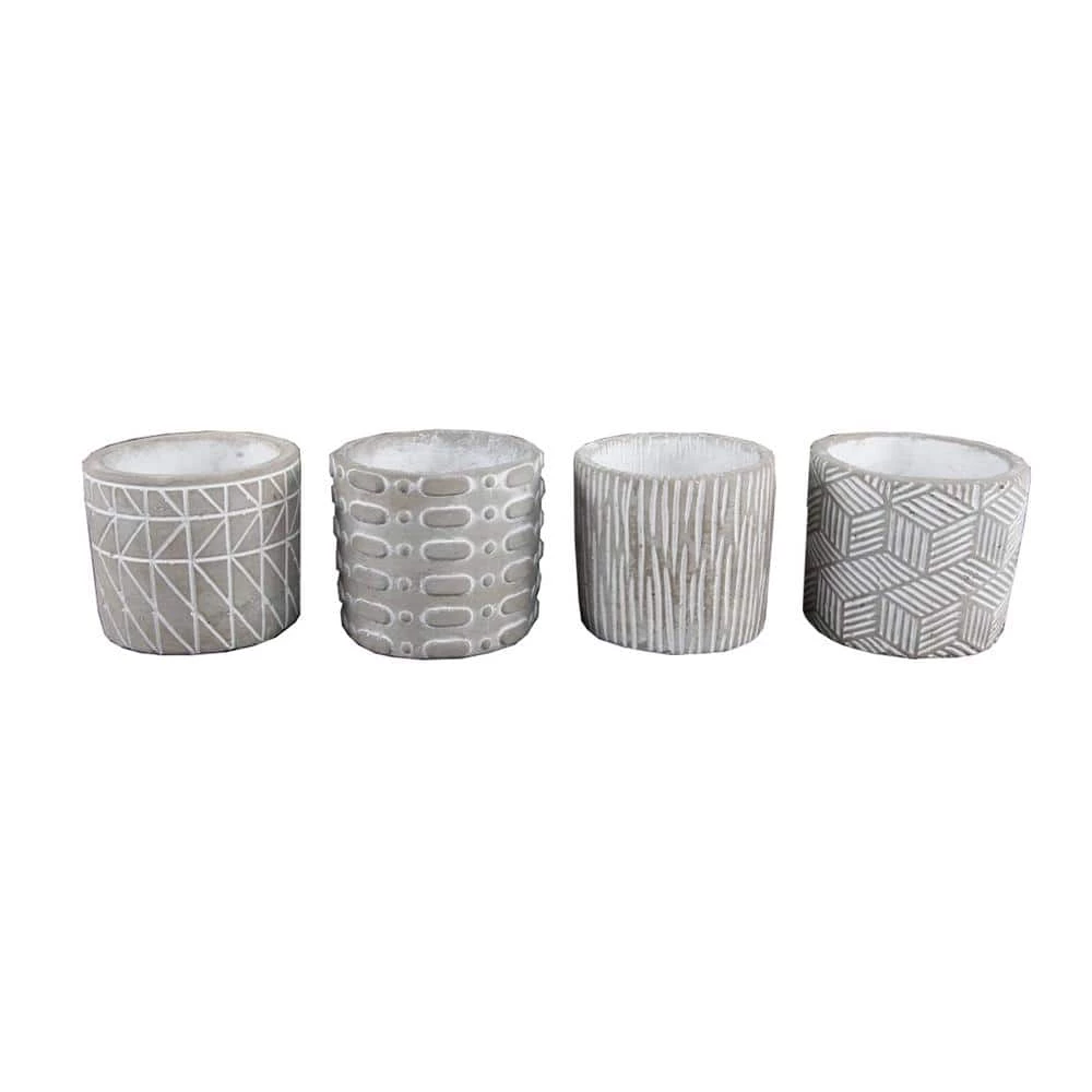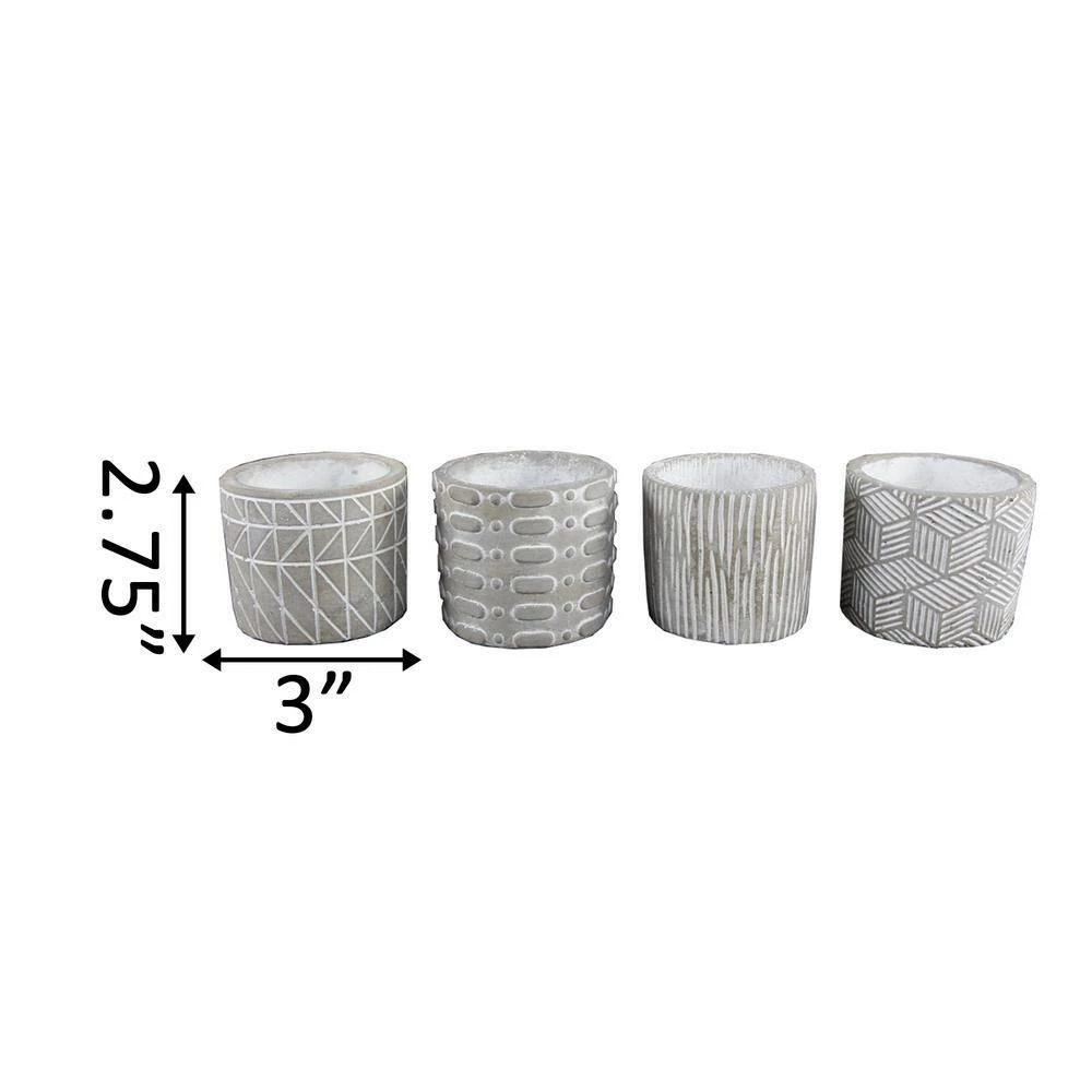 SET OF 4, 4 in. Cement pot on Tray. Lovely Decor indoor planters. Measurement(inch): 10.25 in. x 10.25 in. x 5.375 in. Intersize(inch): 3.5 in. x 3.5 in. x 3.25 in. Capacity(oz): 50.4 oz. Material: Cement. Color: Grey No drainage hole, for Indoor use only.