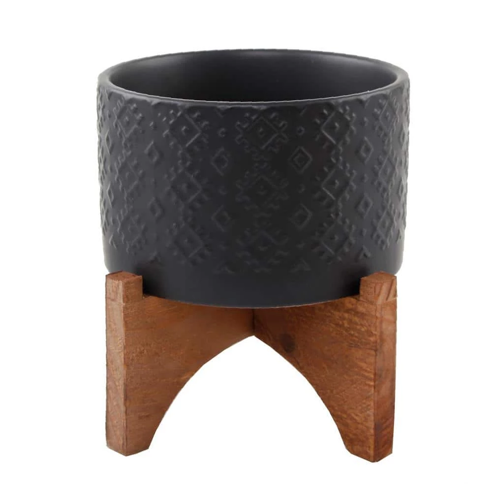 Stand by me. Place this Indian Pot on Wood stand anywhere in your home to create an indoor Oasis. Hand-crafted by Artisans, our ceramic planter on wood stand will help upgrade your plant game in style. Made of ceramic with an Indian pattern and painted matte black, this tabletop planter will add a bit of chic nature to your living space. Buy a few at a time, so you can start your own little Garden indoors. (Hand-crafted by Artisans, Material: Ceramic, Wood. Size: 6.25 in. x 6.25 in. x 6.25 in., Inter: 4.75 in. x 4.75 in. x 3 in. Capacity: 31.75 oz. Color: black, brown). No drainage hole.