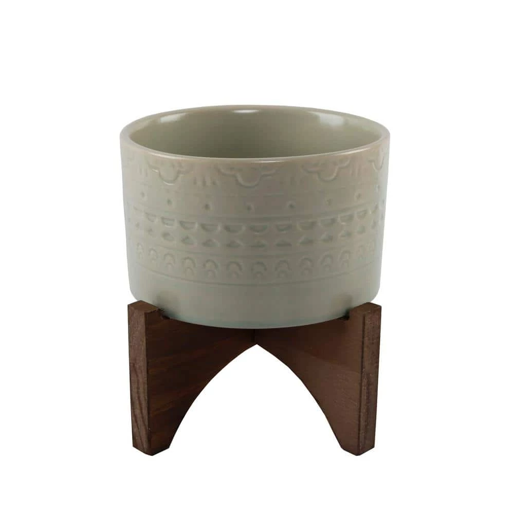 5 in. Mayan Ceramic Planter on Wood Stand, Matte Sage. Lovely Decor indoor planters. Measurement(inch): 6.25 x 6.25 x 6.25. Intersize(inch): 4.75 x 4.75 x 3. Capacity(oz):31.75. Material: Ceramic, Wood, Glue. Color: Sage. No drainage hole, for Indoor use only.