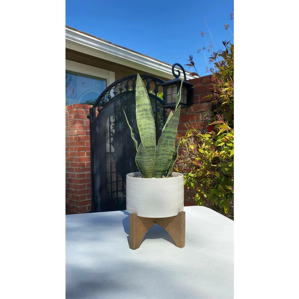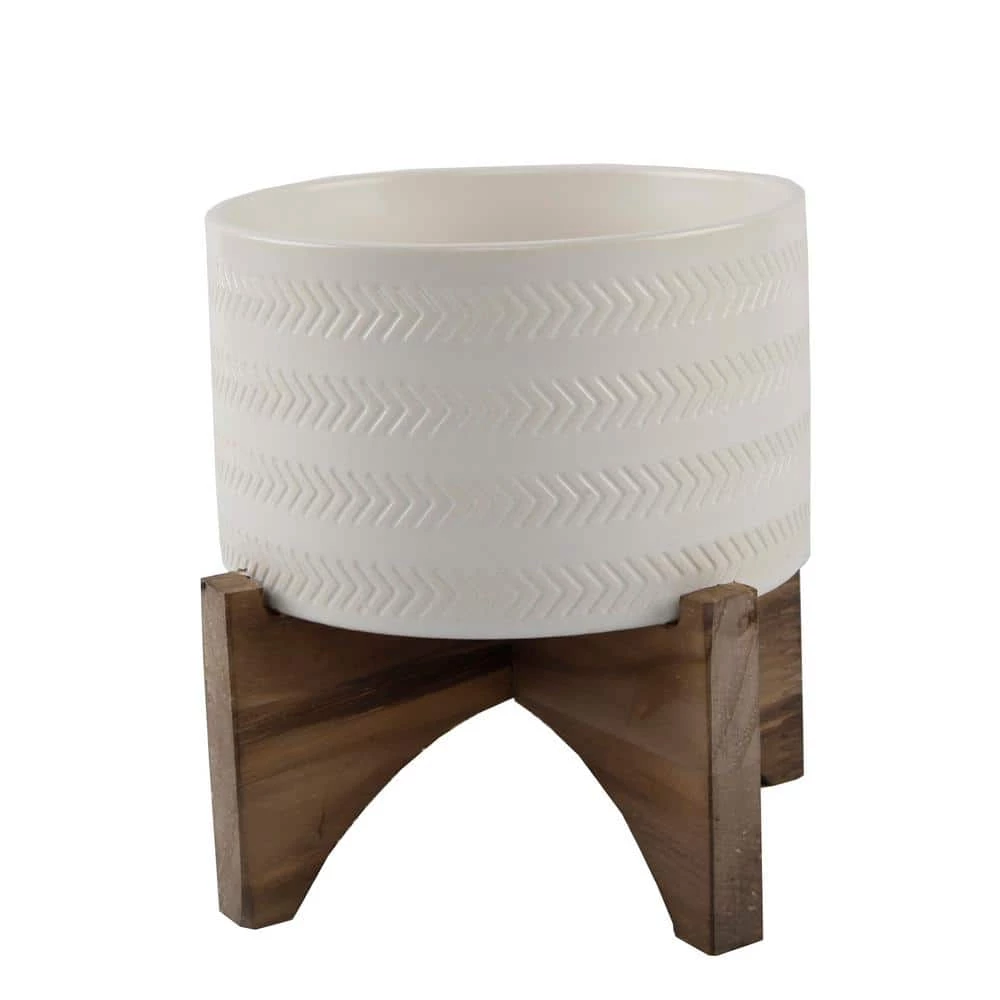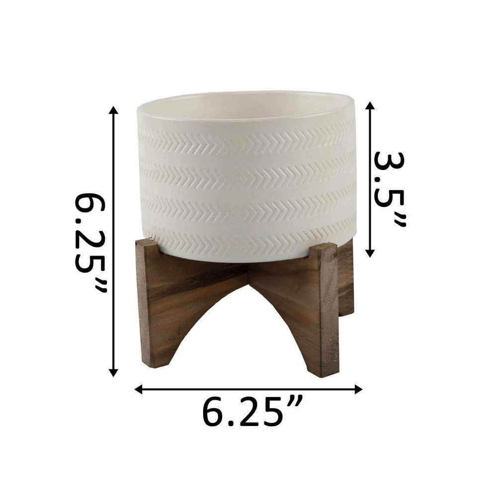 5 in. Arrow Ceramic Planter on Wood Stand, Matte White. Lovely Decor indoor planters. Measurement(inch): 6.25 in. x 6.25 in. x 6.25 in. Intersize(inch): 4.75 in. x 4.75 in. x 3 in. Capacity(oz):31.75 oz. Material: Ceramic, Wood, Glue. Color: Matte White No drainage hole, for Indoor use only.