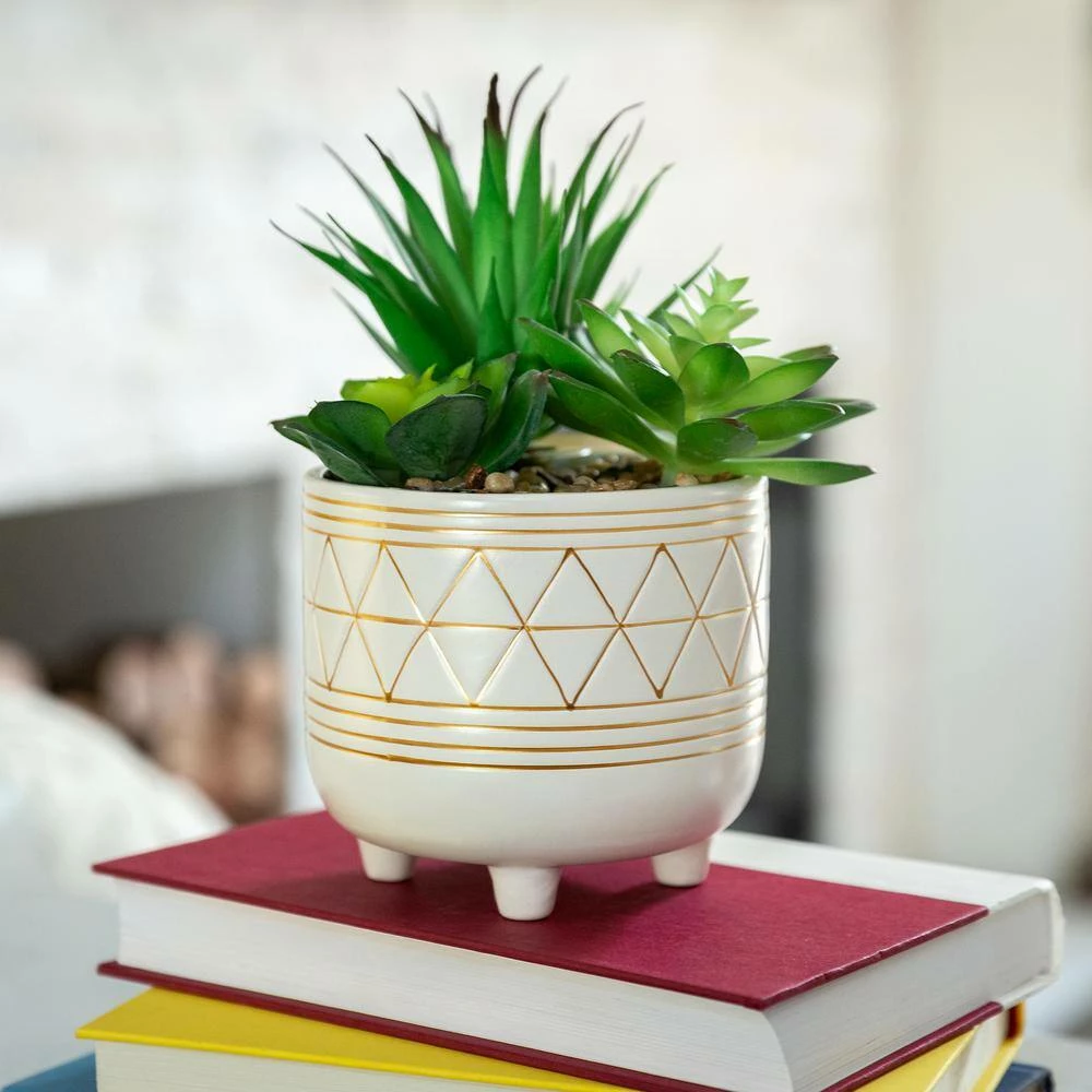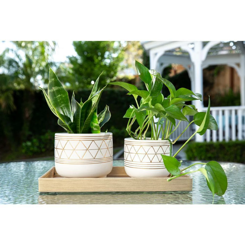 Meet Stumpy. Place these GEO Stumpy Succulent Planters anywhere in your home to create an indoor Oasis. Hand-crafted by Artisans, our ceramic planter with Stumpy legs will help upgrade your plant game in style. Made of ceramic and painted white with gold geometric lines, this 6.5 in. x 6.5 in. x 5 in. tabletop planter will add a bit of chic antiquity to your living space. The perfect planter for planting succulents, terrariums and indoor house plants. There is no drainage hole, so no spill and no mess. We always strive to make your life easier so you that you can have more time for the important things in life. Buy a few at a time, so you can start your own little Garden indoors. (Hand-crafted by Artisans, Material: Ceramic, Wood, Size: 6.5 in. x 6.5 in. x 5 in., Color: White, Gold). No drainage hole, for Indoor use only.