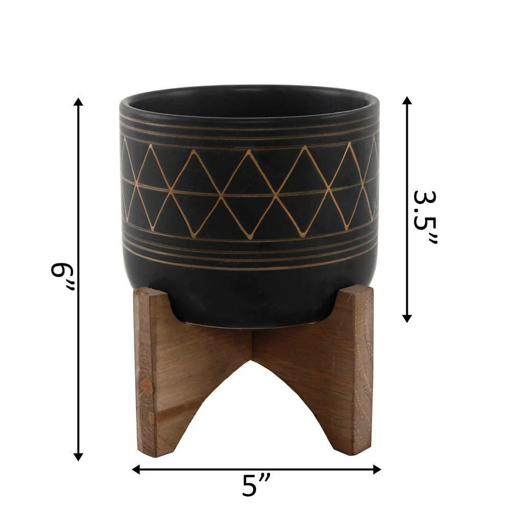 Stand by me. Place these succulent planters anywhere in your home to create an indoor Oasis. Hand-crafted by Artisans, our ceramic planter on wood stand will help upgrade your plant game in style. Made of ceramic and painted White with Black geometric lines, this 5 in. x 5 in. x 6 in. tabletop planter will add a bit of chic antiquity to your living space. The perfect planter for planting succulents, terrariums, and indoor house plants. There is no drainage hole, so no spill and no mess. We always strive to make your life easier so you that you can have more time for the important things in life. Buy a few at a time, so you can start your own little Garden indoors. (Hand-crafted by Artisans, Material: Ceramic, Wood, Size: 5 in. x 5 in. x 6 in., Color: White, Black, Brown-stand). No drainage hole, for Indoor use only.