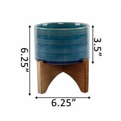 Flora Bunda 5 in. Glass Teal Blue Arrow Ceramic Plant Pot on Wood Stand Mid-Century Planter