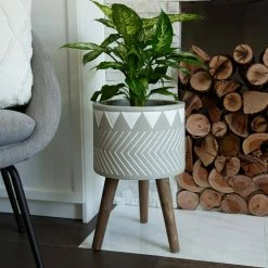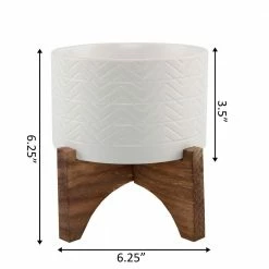 Flora Bunda Mid-Century 7 in. White/Black Line Ceramic Geometric Pot with Wood Stand Planter