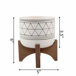Flora Bunda Mid-Century 5 in. White/Black Line Ceramic Geometric Pot with Wood Stand Planter